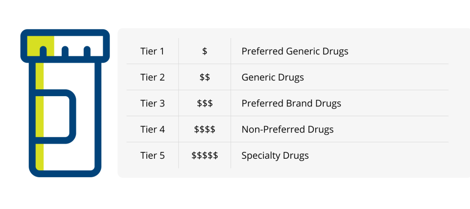 Prescription drugs are categorized by tier based on the price and type of drug. Prescription drug tiers are organized from least to most costly, from Tier 1 to Tier 5. These tiers include preferred generic drugs (Tier 1), generic drugs (Tier 2), preferred brand drugs (Tier 3), non-preferred drugs (Tier 4), and specialty drugs (Tier 5).